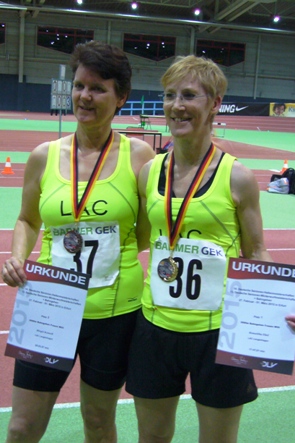 Auch Birgit Komoll konnte sich in ihrer Klasse W 55 Hoffnung auf eine gute Platzierung machen. Im vergangenen Jahr hatte sie in genau 20 Minuten Platz 6 belegt. In Erfurt teilte sie sich ihr Rennen wieder gut ein und kam in 20:03,57 bis auf 4 Sekunden an ihre Vorjahreszeit heran, gegen Ilona Kirchesch (18:27,28) von der LG Rhein-Wied und Marita Echle (19:38,30) aus Biberach kam sie jedoch nicht ganz an. Trotzdem war die Freude bei Birgit Komoll groß darüber, dass auch sie eine Medaille für den LAC Langenhagen geholt hatte. Stolz posierten die beiden Medaillengewinnerinnen fürs Chronikfoto. Mit ihnen freuten sich Betreuer Juri Ivanov und Hans-Peter Damitz. Letzterer hat seinerzeit die beiden jetzt so erfolgreichen Geherinnen entdeckt. In Erfurt war selbstverständlich auch er wieder am Start. Nach jeweils Platz 7 bei den letzten 4 Deutschen Meisterschaften sollte es diesmal schon ein bisschen mehr werden. Dieser Wunsch sollte in Erfüllung gehen. In seiner Klasse M 70 konnte Hans-Peter Damitz mit 20:13,31 seine Vorjahreszeit um starke 50 Sekunden verbessern. Als Lohn gab es diesmal Platz 4 und für den fünfmaligen Deutschen Meister die Erkenntnis, dass für ihn die Medaillenplätze wieder ins Blickfeld gerückt sind.