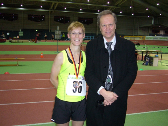 Ja, ich freue mich riesig, obwohl es ziemlich hart war. Hab 2 Verwarnungen kassiert und gefürchtet, ich fliege raus. Bin die ersten 1000 m in 5:30 gegangen, hätte unter 17 min gehen können, hab dann aber wegen der Verwarnungen das Tempo gedrosselt. Ich hab dann nur gehofft, dass ich vor meiner stärksten Konkurrentin, der Vorjahressiegerin Antje Köhler, bleiben kann. Aber Peter an der Bahn hat mir immer die Abstände gesagt, so dass ich wusste, ob ich nochmal ne Schippe zulegen muss oder auf Sicherheit gehen kann. Danke an Peter an dieser Stelle.
