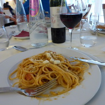 Das Hotel war selbst für deutsche Verhältnisse gut organisiert und wir bekamen relativ schnell ein 3-Gänge-Menü serviert. Die Vorspeise war die Pasta, die Leistungssportler und/oder Vegetarier unter uns hätten auch mehr davon vertragen (zum Schluss gabe es aber noch einen Nachschlag). Dann das Schnitzel und zum Nachtisch Eis. Schmeckte sehr gut. Eine Flasche Rotwein gabe es dazu auch noch kostenlos.