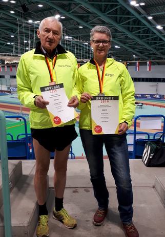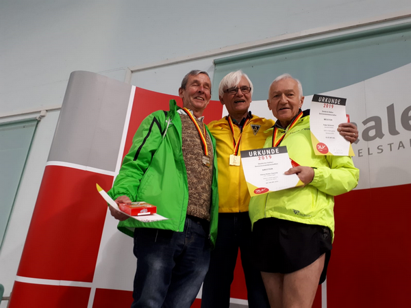 mit einem Schuss Optimismus im Gepäck fuhren wir drei Geher Birgit Komoll, Reinhard Krüger und ich zu den Deutschen Hallen-Seniorenmeisterschaften im 3000 Meter Gehen nach Halle an der Saale. Hatten wir doch zuvor beim nationalen Gehen in Erfurt und der offenen Berlin/Brandenburgischen Meisterschaft in Berlin mit Podiumsplätzen aufhorchen lassen. Dass jedoch bei Deutschen Meisterschaften die Erfolgslatte noch einmal höher gelegt ist, merkte ich schon mit dem Startschuss. In meiner Klasse M 75 legten sich sofort die beiden Favoriten Peter Schumm von Alemannia Aachen und Wolf-Dieter Giese vom PSV Berlin mächtig ins Zeug. Dahinter folgten Heinz-Jürgen Mittmann (ebenfalls PSV Berlin) und ich. Und schon walteten die Gehrichter ihres Amtes und verteilten großzügig Verwarnungen wegen gesichteter Gehfehler. Die Verwarntafel füllte sich und mehrere Akteure wurden nach 3 Verwarnungen auf dem Wettbewerb genommen. Als dann die Chefgehrichterin mit beherzten Schritten und der berüchtigten roten Kelle auf den an zweiter Position gehenden Giese zukam und den Berliner disqualifizierte, realisierte ich, dass ich nun auf Medaillenkurs unterwegs war. Ich konnte nun alles auf eine Karte setzen und versuchen, Heinz-Jürgen Mittmann noch niederzuringen um damit vielleicht noch aus Bronze Silber zu machen oder Platz 3 abzusichern. Ich entschied mich für meinen letzteren Gedanken und wurde am Ende mit der Bronzemedaille belohnt. In meiner bisherigen Zeit als Geher ist dies mein dritter Podiumsplatz in der Einzelwertung und meine erste DM-Medaille für den LAC.