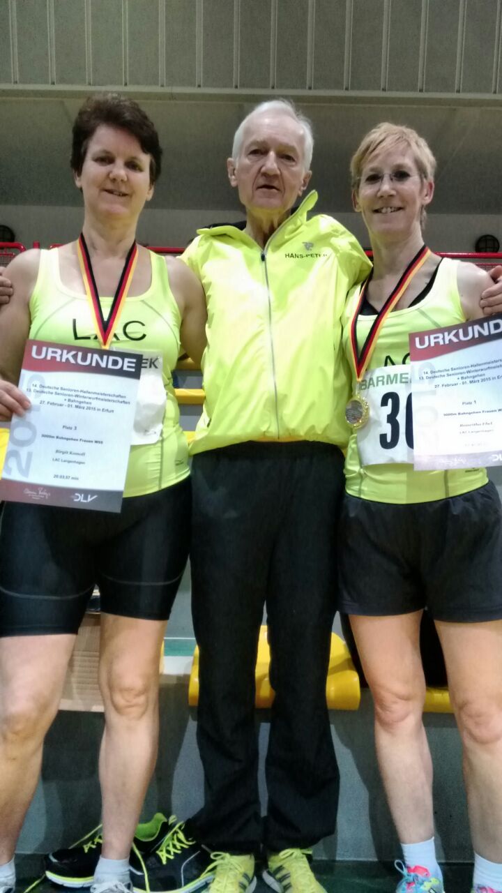 Auch Birgit Komoll konnte sich in ihrer Klasse W 55 Hoffnung auf eine gute Platzierung machen. Im vergangenen Jahr hatte sie in genau 20 Minuten Platz 6 belegt. In Erfurt teilte sie sich ihr Rennen wieder gut ein und kam in 20:03,57 bis auf 4 Sekunden an ihre Vorjahreszeit heran, gegen Ilona Kirchesch (18:27,28) von der LG Rhein-Wied und Marita Echle (19:38,30) aus Biberach kam sie jedoch nicht ganz an. Trotzdem war die Freude bei Birgit Komoll groß darüber, dass auch sie eine Medaille für den LAC Langenhagen geholt hatte. Stolz posierten die beiden Medaillengewinnerinnen fürs Chronikfoto. Mit ihnen freuten sich Betreuer Juri Ivanov und Hans-Peter Damitz. Letzterer hat seinerzeit die beiden jetzt so erfolgreichen Geherinnen entdeckt. In Erfurt war selbstverständlich auch er wieder am Start. Nach jeweils Platz 7 bei den letzten 4 Deutschen Meisterschaften sollte es diesmal schon ein bisschen mehr werden. Dieser Wunsch sollte in Erfüllung gehen. In seiner Klasse M 70 konnte Hans-Peter Damitz mit 20:13,31 seine Vorjahreszeit um starke 50 Sekunden verbessern. Als Lohn gab es diesmal Platz 4 und für den fünfmaligen Deutschen Meister die Erkenntnis, dass für ihn die Medaillenplätze wieder ins Blickfeld gerückt sind.