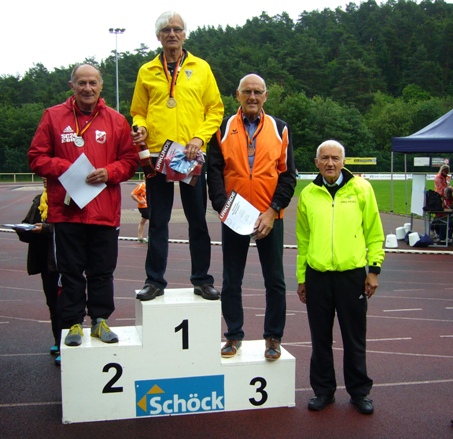 An diesem Wochenende war ich gleich in zwei verschiedenen Leichtathletikdisziplinen bei Meisterschaften unterwegs. Am Samstagmorgen ging es per ICE nach Baden-Baden. Von dort mit dem Regionalzug nach Bühl. In Bühl wurden alle mit dem Zug zur Deutschen Meisterschaft im 5000m Bahngehen angereisten Teilnehmer mit einem DM-Shuttlebus direkt zum Stadion von Bühlertal gefahren (und später auch pünktlich wieder zurück). Hierfür gebührt dem Veranstalter Klaus Dietsche ein ganz besonderer Dank. Für das Wetter zeichnete der Klaus (der zwischendurch auch noch selbst an den Start ging und in M 50 Deutscher Vizemeister wurde) jedoch nicht verantwortlich. In der Höhe des Nordschwarzwaldes war es schwül/warm. Als die Seniorinnen an den Start gingen, regnete es ein wenig. Sofort darauf ließ die brennende Sonne die Feuchtigkeit verdampfen. Die Ladies fühlten sich wie in der Sauna. Für uns Senioren kam es anschließend aber so richtig dicke. Bald nach dem Start ließen dunkle Wolken nichts Gutes ahnen. Und dann ging es auch schon los, es schüttete wie aus Kübeln und ein Gewitter wurde immer bedrohlicher. Während die Akteure gegen die Wassermassen und den Temperatursturz kämpften und hofften, dass das Gewitter nicht zu heftig werden möge, forderte der Stadionsprecher die Zuschauer auf, sich in die sichere Sporthalle zurückzuziehen. Pausenlos berieten die Verantwortlichen über einen Abbruch des Wettbewerbes. Das Gewitter schrammte dann aber doch noch gerade so am Stadion vorbei, so dass alle Teilnehmer zwar völlig aufgeweicht, aber sicher ins Ziel kamen. Einer meinte anschließend, dass dies heute für ihn kein richtiger Gehwettbewerb gewesen sei, dafür habe er aber endlich sein „Seepferdchen“ gemacht. By the way, ich bin Sechster in M 70 geworden. Wenn man bedenkt, dass dort auf dem Berg von Bühlertal alles am Start war, was in dieser Klasse in Deutschland Rang und Namen hat und sogar der große Karl Degener „nur“ Platz 4 belegte, kann ich sehr zufrieden sein. Außerdem habe ich mit meiner Zeit von 36:27,82 meine Qualifikationsnorm für 2018 (36:30) erfüllt. Dann starte ich in M 75. Nun muss ich mich nur noch um die Norm für 2017 kümmern (35:35)…