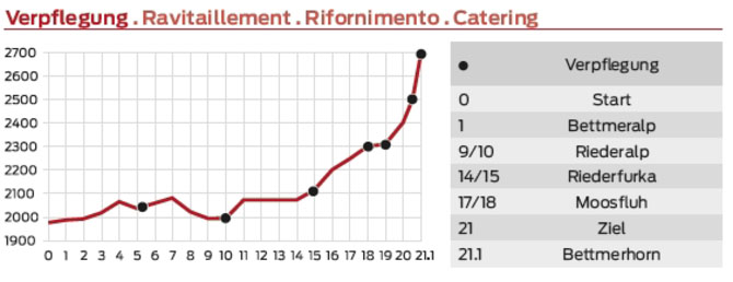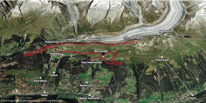Gestartet wird auf der Bettmeralp, einem autofreien Bergdorf der Aletsch Arena auf rund 2000 Metern Höhe. Das Ziel wird nach 21,1 km und Überwindung von rund 1050 Höhenmetern an der Bergstation des Bettmerhorns erreicht. Allein auf dem letzte Kilometer bis zum Ziel müssen 300 Höhenmeter bewältigt werden, was allen Teilnehmern das Äußerste abverlangt.