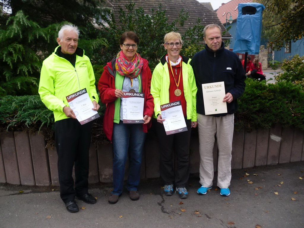 Gut vorbereitet fuhren 4 Geherinnen und Geher von DJK Sparta Langenhagen zur Deutschen Meisterschaft im 10 km Straßengehen nach Gleina bei Naumburg. Roswitha Ebel (die im vorigen Jahr als Meisterschaftsneuling mit ihrer Zeit von 1:08:03 Stunden überraschend Vizemeisterin geworden war) und Birgit Komoll wurden in der Klasse W 50 Medaillenchancen eingeräumt. Bei idealen Voraussetzungen mit ruhigem Herbstwetter ging der Plan der Langenhagener auf dem 1 km Pendelkurs auf, dass Spartas neuer Geher Juri Ivanov, der sich ebenfalls im Teilnehmerfeld befand, möglichst seiner Vereinskollegin Roswitha Ebel Schrittmacherdienste leisten sollte. Mit diesem Duo konnte schon bald keine Teilnehmerin mehr mithalten. So ging die Langenhagenerin in 1:04:46 unangefochten zum Deutschen Meistertitel. Mit dieser Zeit verbesserte sie ihre Bestleistung über die 10km-Distanz um über 3 Minuten. Ihr Vereinskollege und Pacemaker Juri Ivanov (Klasse M 55), der in der Meisterschaftswertung noch nicht geführt wird, drehte gegen Ende noch einmal auf und holte sich in der internationalen Wertung der Gleinaer Schleife Platz 1 in 1:04:20. Hinter Roswitha Ebel lieferten sich mit 4 Minuten Abstand gleich 3 Teilnehmerinnen ein packendes Finish um die weiteren Medaillen. Den Doppelerfolg für Sparta Langenhagen durchkreuzte dann nur knapp die Berlinerin Brigitte Zeidler. Mit 24 Sekunden Vorsprung rettete sie die Silbermedaille vor Birgit Komoll (1:08:47) ins Ziel. Nur 22 Sekunden dahinter musste sich Monika Müller vom TV Groß-Gerau mit Platz 4 begnügen.