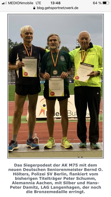 Für den LAC bin wohl nur ich bei der Bahn-DM in Baunatal an den Start gegangen und zwar im 5000m Bahngehen in der Klasse M 75. Die Bewerber um den DM-Titel und die Podiumsplätze kennen sich von vielen nationalen Wettbewerben. Als dann in Baunatal der Aachener Peter Schumm und die beiden Berliner Bernd Ocker Hölters und Wolf Dieter Giese an der Spitze ein Trio bildeten, war mir klar, dass ich da nicht mithalten konnte. Mit deutlichem Abstand ging ich an Position 4. Eine Medaille war in weiter Ferne. Dann setzte sich Hölters etwas ab und Schumm und Giese kämpften um Silber. Dabei wurde der Gehstil von Giese schlechter. Dies blieb den strengen Gehrichtern (es war schließlich eine DM) nicht verborgen. Nach der dritten Verwarnung holten sie den Berliner „in die Box“, wo er eine Zeitstrafe von 30 Sekunden abstehen musste. Diese Regelung ist ziemlich neu und wurde erst zum zweiten Mal bei einer DM angewandt. Als Giese wieder auf der Bahn war, erhielt er bald darauf eine vierte Verwarnung, die seine Disqualifikation zur Folge hatte. Im Eifer des Gefechts bekam ich dies gar nicht mit und nahm an, dass ich den undankbaren vierten Platz belegt hatte. Es war dann der Disqualifizierte selbst, der mich darüber informierte, dass ich doch noch unerwartet Bronze gewonnen hatte. So bin ich zu meiner insgesamt 17. DM-Medaille gekommen.