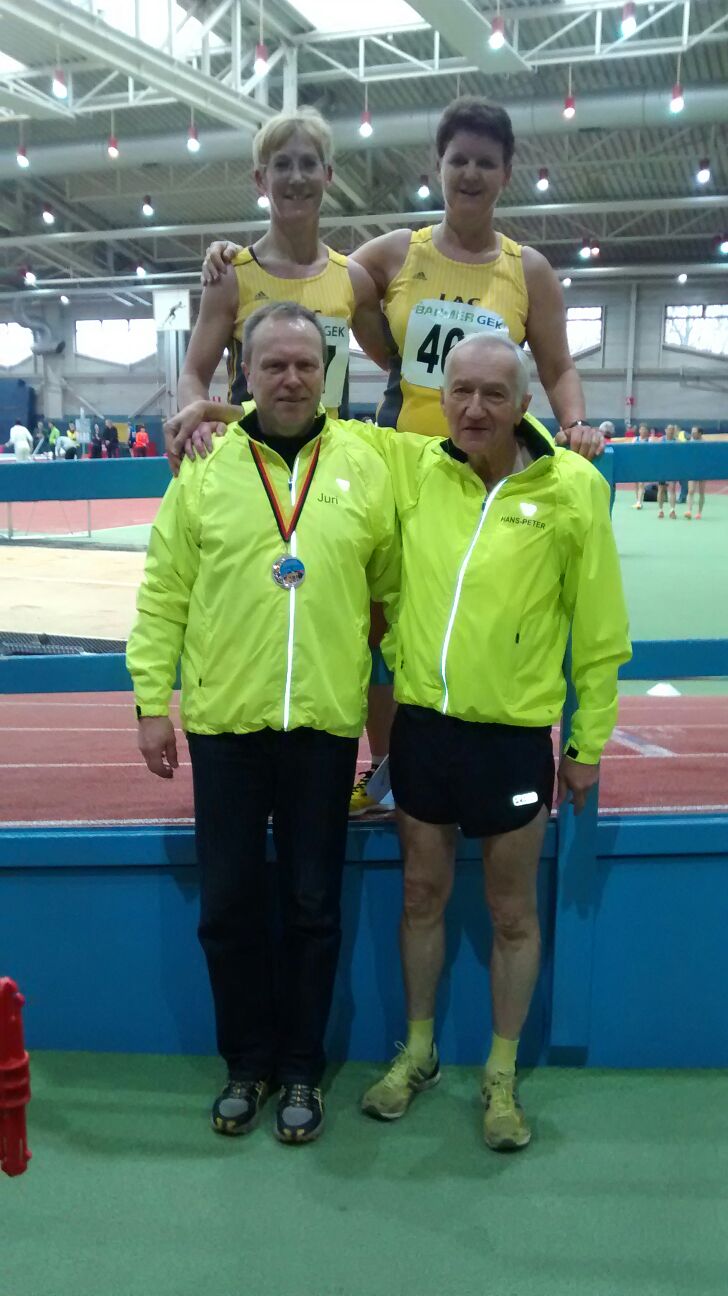 Das konnte sich Bernd Müller, der Vorsitzende des LAC Langenhagen, nicht entgehen lassen, 4 Geher seines Leichtathletikclubs hatten sich für die Deutsche Hallenmeisterschaft im 3000 Meter Gehen qualifiziert und jedem von ihnen wurden Medaillenchancen eingeräumt. Deshalb begleitete er zusammen mit Frau Liane seine Sportler nach Erfurt und dekorierte auch gleich selbstbewusst die Hallentribüne mit einem großen gelb/schwarzen Vereinstransparent. Im ersten Wettbewerb der Teilnehmer ab 60 Jahre waren im 20 köpfigen Teilnehmerfeld die beiden LAC-ler Juri Ivanov (Klasse M 60) und Hans-Peter Damitz (M 70) am Start. Mit tatkräftiger Unterstützung ihrer Fans konnten beide Master ihre Anfang des Jahres in Berlin aufgestellten Saisonbestleistungen unterbieten. Das reichte aber nicht, um an den ganz starken Mitbewerbern vorbeizukommen. Juri Ivanov kam jedoch das Glück des Tüchtigen zu Hilfe. Kontrahent Alfons Schwarz aus Bühlertal im Schwarzwald machte beim Verteidigen seines Podestplatzes so deutliche Gehfehler, dass er gleich von 4 Gehrichtern Verwarnungen erhielt und aus dem Wettbewerb genommen wurde. Damit schaffte es der Langenhagener in 18:12 Minuten noch auf den Bronzeplatz. Ein Erfolgserlebnis ganz anderer Art hatte Hans-Peter Damitz. Er, der im vergangenen Jahr bei den Deutschen Meisterschaften in Düsseldorf und Andernach wegen Gehfehlern disqualifiziert worden war, hatte daraufhin zusammen mit Betreuer Juri schwerpunktmäßig an seinem Gehstil gearbeitet. Die Mühe hat sich gelohnt, die Gehrichter ließen ihn in Erfurt in 21:21 Minuten auf Platz 4 gehen.