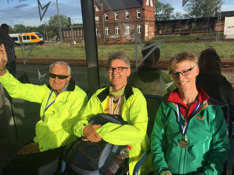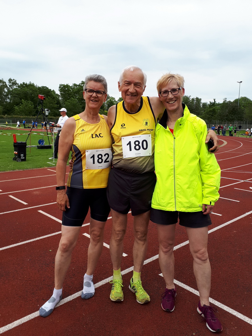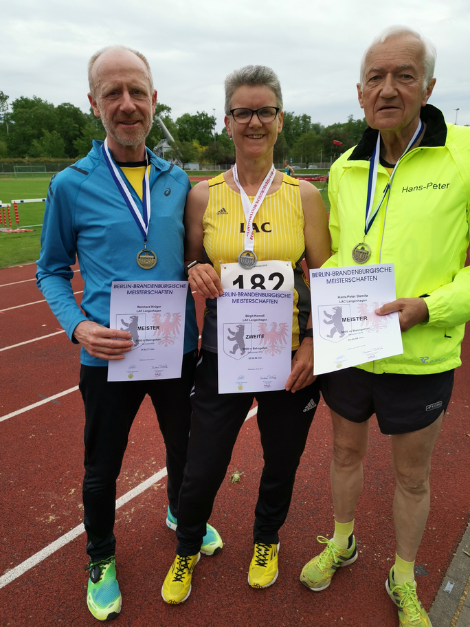 Gerademal 24 Stunden später waren diese beiden Geher schon wieder im Einsatz. Die Landesverbände Berlin und Brandenburg steigern die Leistungen bei ihren Meisterschaften, indem sie diese offen auch für Athleten aus anderen Verbänden ausschreiben. Der LAC hat auf Grund dieser Regelung schon so manche Medaille nach Langenhagen entführt. Zuletzt gab es Anfang des Jahres in Berlin bei der Meisterschaft im 3000 Meter Hallengehen 3 Mal Silber für das Trio Birgit Komoll, Reinhard Krüger und Hans-Peter Damitz. Über die 5000 Meter auf der Bahn ging es diesmal im brandenburgischen Rathenow. Und wieder bewarben sich auch die LAC-Geher um die Meistermedaillen. Da Reinhard Krüger (Klasse M 55) sich am Vortag in Erfurt ein bisschen Kraft aufsparte und Hans-Peter Damitz (M 75) dort ganz auf einen Start verzichtet hatte, konnten beide beim Meisterschaftsrennen auftrumpfen. Diese Taktik zahlte sich aus. Trotz eines böigen Windes im Stadion holten sie sich die Meistertitel. Für die Dritte im Team des LAC Langenhagen, Birgit Komoll (W 55), kam es zu einem Zusammentreffen mit Roswitha Ebel. Sie gehörte bis Ende des vergangenen Jahres zum LAC-Team und hat dort für ihren Club beachtliche internationale und nationale Erfolge errungen. Mit Beginn des nächsten Jahres wird sie wieder für ihren alten Verein an den Start gehen. Erst einmal entführte sie jedoch in Rathenow den diesjährigen Titel einer Berlin/Brandenburgischen Meisterin nach Hannover zum dortigen Verein Polonia. Nur 11 Sekunden hinter Roswitha Ebel (32:43,86 Minuten) kam nach hartem Finish ihre ehemalige und zukünftige Clubkollegin Birgit Komoll über die Ziellinie (32:54,94). Auf Platz 3 folgte in 34:08,81 Birgit Zeidler aus Berlin. Die Fahrt der Geherinnen und Geher vom LAC bzw. von Polonia Hannover hatte sich einmal mehr gelohnt, konnten sie doch diesmal allein von der Berlin/Brandenburgischen Meisterschaft 3 Gold- und 1 Silbermedaille mit nach Hause bringen. Spätestens Mitte August wird man sich bei der Deutschen Meisterschaft im 5000 Meter Bahngehen wieder im Stadion an der Startlinie treffen.