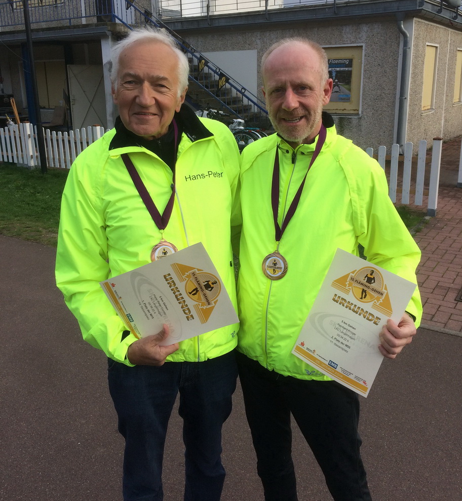 Auf nationaler Ebene beendeten die Geher ihre Freiluftsaison im brandenburgischen Jüterbog. Reinhard Krüger vom LAC Langenhagen, der erst kürzlich bei der Deutschen Meisterschaft im 10 Kilometer Straßengehen die Bronzemedaille in seiner Klasse M 55 errang und sein Clubkollege Hans-Peter Damitz (Klasse M 75), der auch schon in diesem Jahr Bronze bei einer DM geholt hatte, wollten ihre erfolgreiche Saison zum Abschluss mit einem Sieg in Jüterbog krönen. Es war empfindlich kalt geworden. Schon vor dem Beginn der Wettbewerbe fuhr Hans-Peter ein heftiger Krampf in beide Waden, sodass er befürchten musste, hier gar nicht an den Start gehen zu können.