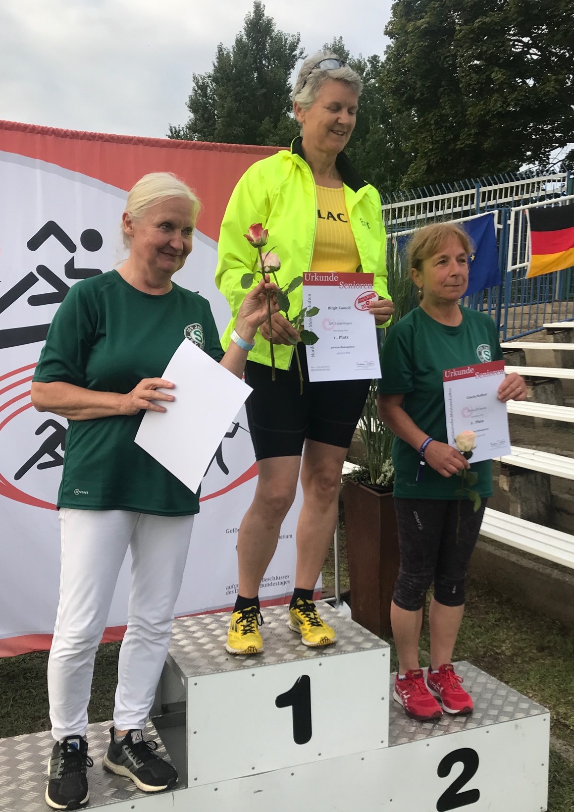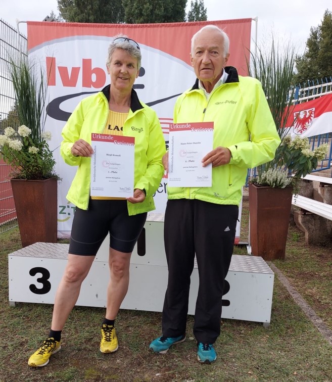 Die beiden Geher des LAC Langenhagen, Birgit Komoll (Klasse W 60) und Hans-Peter Damitz (M 75), rechneten sich gute Chancen auf Podiumsplätze aus, als sie sich auf den Weg in die Stadt Brandenburg zur Norddeutschen Meisterschaft im 5000 Meter Bahngehen machten. Teil ihrer Vorbereitungen auf diese Meisterschaft war ein Gehen über dieselbe Distanz in Horneburg im Alten Land gewesen. Jene Startgelegenheit hatten auch viele andere Geherinnen und Geher aus Norddeutschland und besonders Geher aus Berlin genutzt. Jener Teilnehmerkreis traf nun in Brandenburg bei der Meisterschaft erneut aufeinander. Birgit Komoll hatte sich vor wenigen Wochen beim Vorbereitungswettkampf nur knapp Cora Kruse aus Magdeburg geschlagen geben müssen. Diesmal brauchte sich die Langenhagenerin mit dieser starken Konkurrentin nicht auseinanderzusetzen, da das Bundesland Sachsen-Anhalt nicht zu Norddeutschland zählt. So war für die Geherin vom LAC der Weg frei zum Meistertitel. Mit deutlichem Vorsprung ging sie mit persönlicher Jahresbestzeit in 34:13,11 Minuten zum Meistertitel. Dabei war sie 30 Sekunden schneller als bei der Generalprobe. Platz 2 sicherte sich die Berlinerin Gisela Seifert (38:15,87) vor ihrer Vereinskollegin Sabine Balzer-Kappner (39:07,35).