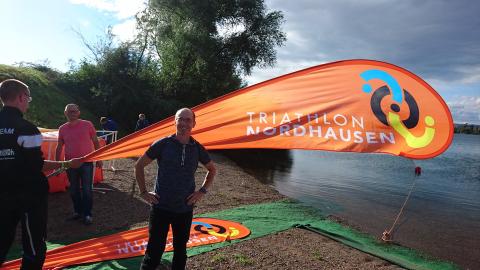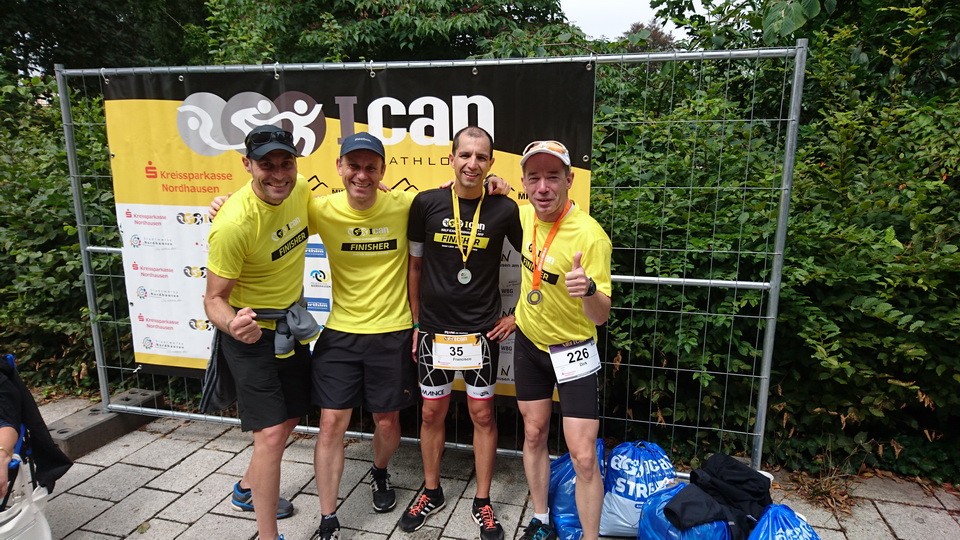 Am 21.08.2017 fand in Nordhausen in Thüringen der ICAN-Triathlon statt. Ich bin mal wieder auf der etwas erweiterten Olympischen Distanz (SWIM 1km - BIKE 53km - RUN 10km) gestartet. Geschwommen wird in einem glasklaren Tauchsee. Hochschauen braucht man beim Schwimmen nicht, weil man unter Wasser die anderen Schimmer und die Leinen der Bojen sehr gut sehen kann. Somit gibt es auch nicht das Gekoppe an den Bojen und es geht sehr entspannt zur Sache. Bin dann nach etwa 20Minuten Schwimmen für den Kilometer ins Zelt zum Wechseln. Der Platz neben mir wird von der Profi-Triathletin Katja Konschak aufgesucht. Die ist in 25 Minuten nun 2 Kilometer geschwommen. Ich also hinterher, aufs Rad und los, immer dranbleiben. Das habe ich dann ca. 7 km gehalten, dann ging es in die Berge. Tolle Strecke mit super Aussicht. Volle Pulle runter nach Nordhausen. Beim Wechsel gepatzt und das Radtrikot (wegen Kälte übergezogen) vergessen auszuziehen. Wieder zurück und so 45 Sekunden verbummelt. Dann auf die Hammer-Laufstrecke. Tausend Kurven, ständig wechselnder Untergrund und dann immer rauf, rauf, rauf, runter, noch ne Runde. Ich habe mächtig überholt auf dem Rad und hatte dann leider beim Laufen keinen mehr in der Nähe gehabt. Somit recht einsam auf Rang 22. gelaufen und den 2. Platz der Altersklasse ergattert.