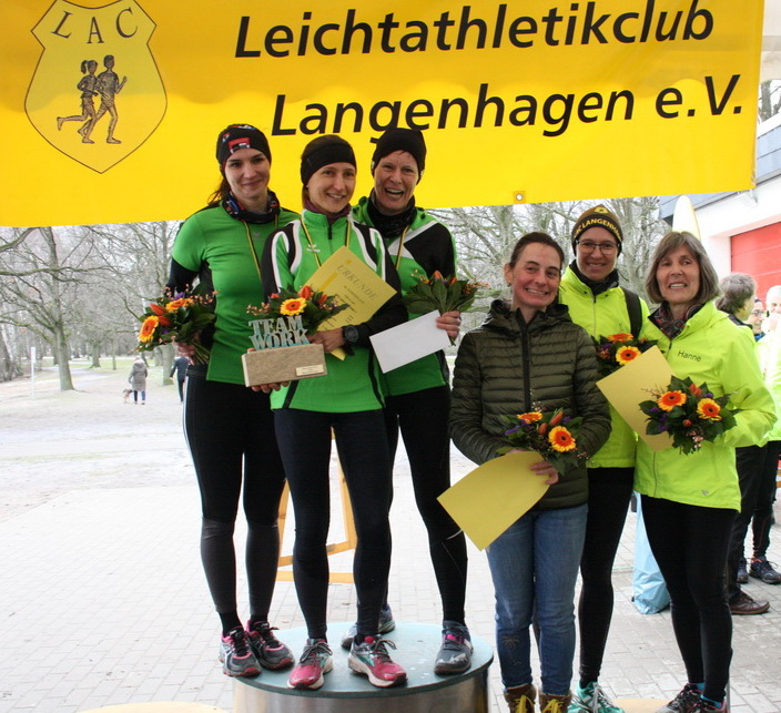 Die Mannschaftswertung der Frauen teilten sich die Lokalmatadorinnen vom TuS Bothfeld (Bode, Marquardt, Liersch) und dahinter der LAC Langenhagen (Jakobus, Brandes, Austermann). Der dritte Platz ging an das Team aus Adelheidsdorf (Suchy, Kiehne, Busch).